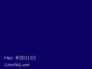 Hex #0e0165 Color is a very dark indigo color and the nearest color is Arapawa #110c6c. Hex code #0e0165 and RGB value is rgb(14,1,101). In RGB color space, this color is composed of 5% red, 0% green, 40% blue, In CMYK color space, this color is composed of 86% cyan, 99% magenta, 0% yellow , 60% black , In HSL color space, this color has a hue angle of 248° , 98% saturation and 20% lightness.