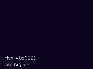Hex #0e0221 Color is a almost black violet color and the nearest color is Black Russian #0a001c. Hex code #0e0221 and RGB value is rgb(14,2,33). In RGB color space, this color is composed of 5% red, 1% green, 13% blue, In CMYK color space, this color is composed of 58% cyan, 94% magenta, 0% yellow , 87% black , In HSL color space, this color has a hue angle of 263° , 89% saturation and 7% lightness.