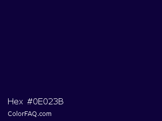Hex #0e023b Color is a very dark indigo color and the nearest color is Black Rock #0d0332. Hex code #0e023b and RGB value is rgb(14,2,59). In RGB color space, this color is composed of 5% red, 1% green, 23% blue, In CMYK color space, this color is composed of 76% cyan, 97% magenta, 0% yellow , 77% black , In HSL color space, this color has a hue angle of 253° , 93% saturation and 12% lightness.