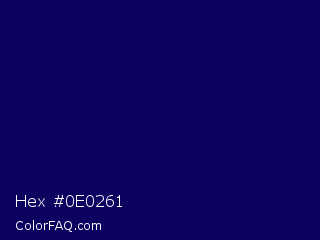 Hex #0e0261 Color is a very dark indigo color and the nearest color is Arapawa #110c6c. Hex code #0e0261 and RGB value is rgb(14,2,97). In RGB color space, this color is composed of 5% red, 1% green, 38% blue, In CMYK color space, this color is composed of 86% cyan, 98% magenta, 0% yellow , 62% black , In HSL color space, this color has a hue angle of 248° , 96% saturation and 19% lightness.