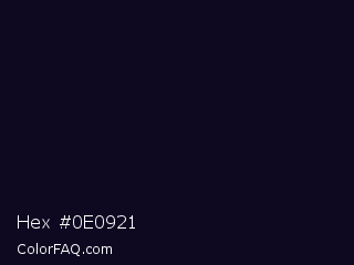 Hex #0e0921 Color is a almost black indigo color and the nearest color is Deep Ebony #0c0b1d. Hex code #0e0921 and RGB value is rgb(14,9,33). In RGB color space, this color is composed of 5% red, 4% green, 13% blue, In CMYK color space, this color is composed of 58% cyan, 73% magenta, 0% yellow , 87% black , In HSL color space, this color has a hue angle of 253° , 57% saturation and 8% lightness.