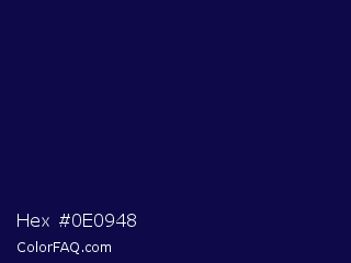 Hex #0e0948 Color is a very dark indigo color and the nearest color is Deep Cove #051040. Hex code #0e0948 and RGB value is rgb(14,9,72). In RGB color space, this color is composed of 5% red, 4% green, 28% blue, In CMYK color space, this color is composed of 81% cyan, 88% magenta, 0% yellow , 72% black , In HSL color space, this color has a hue angle of 245° , 78% saturation and 16% lightness.