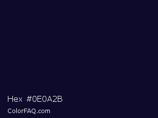 Hex #0e0a2b Color is a very dark indigo color and the nearest color is Black Rock #0d0332. Hex code #0e0a2b and RGB value is rgb(14,10,43). In RGB color space, this color is composed of 5% red, 4% green, 17% blue, In CMYK color space, this color is composed of 67% cyan, 77% magenta, 0% yellow , 83% black , In HSL color space, this color has a hue angle of 247° , 62% saturation and 10% lightness.