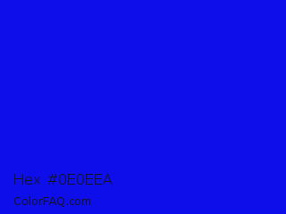 Hex #0e0eea Color is a normal blue color and the nearest color is Bluebonnet #1c1cf0. Hex code #0e0eea and RGB value is rgb(14,14,234). In RGB color space, this color is composed of 5% red, 5% green, 92% blue, In CMYK color space, this color is composed of 94% cyan, 94% magenta, 0% yellow , 8% black , In HSL color space, this color has a hue angle of 240° , 89% saturation and 49% lightness.