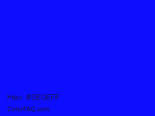 Hex #0e0eff Color is a normal blue color and the nearest color is Blue #0000ff. Hex code #0e0eff and RGB value is rgb(14,14,255). In RGB color space, this color is composed of 5% red, 5% green, 100% blue, In CMYK color space, this color is composed of 95% cyan, 95% magenta, 0% yellow , 0% black , In HSL color space, this color has a hue angle of 240° , 100% saturation and 53% lightness.