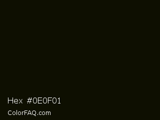 Hex #0e0f01 Color is a almost black yellow color and the nearest color is Black Forest #0b1304. Hex code #0e0f01 and RGB value is rgb(14,15,1). In RGB color space, this color is composed of 5% red, 6% green, 0% blue, In CMYK color space, this color is composed of 7% cyan, 0% magenta, 93% yellow , 94% black , In HSL color space, this color has a hue angle of 64° , 88% saturation and 3% lightness.