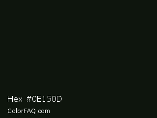 Hex #0e150d Color is a almost black green color and the nearest color is Racing Green #0c1911. Hex code #0e150d and RGB value is rgb(14,21,13). In RGB color space, this color is composed of 5% red, 8% green, 5% blue, In CMYK color space, this color is composed of 33% cyan, 0% magenta, 38% yellow , 92% black , In HSL color space, this color has a hue angle of 113° , 24% saturation and 7% lightness.