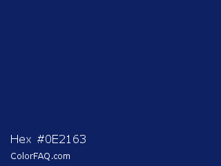 Hex #0e2163 Color is a very dark blue color and the nearest color is Deep Sapphire #082567. Hex code #0e2163 and RGB value is rgb(14,33,99). In RGB color space, this color is composed of 5% red, 13% green, 39% blue, In CMYK color space, this color is composed of 86% cyan, 67% magenta, 0% yellow , 61% black , In HSL color space, this color has a hue angle of 227° , 75% saturation and 22% lightness.