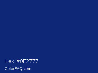 Hex #0e2777 Color is a dark blue color and the nearest color is Catalina Blue #062a78. Hex code #0e2777 and RGB value is rgb(14,39,119). In RGB color space, this color is composed of 5% red, 15% green, 47% blue, In CMYK color space, this color is composed of 88% cyan, 67% magenta, 0% yellow , 53% black , In HSL color space, this color has a hue angle of 226° , 79% saturation and 26% lightness.