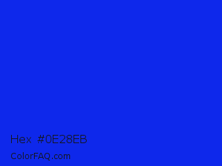 Hex #0e28eb Color is a normal blue color and the nearest color is Bluebonnet #1c1cf0. Hex code #0e28eb and RGB value is rgb(14,40,235). In RGB color space, this color is composed of 5% red, 16% green, 92% blue, In CMYK color space, this color is composed of 94% cyan, 83% magenta, 0% yellow , 8% black , In HSL color space, this color has a hue angle of 233° , 89% saturation and 49% lightness.