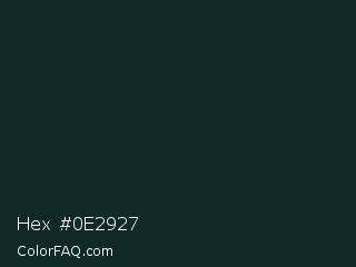 Hex #0e2927 Color is a very dark cyan color and the nearest color is Firefly #0e2a30. Hex code #0e2927 and RGB value is rgb(14,41,39). In RGB color space, this color is composed of 5% red, 16% green, 15% blue, In CMYK color space, this color is composed of 66% cyan, 0% magenta, 5% yellow , 84% black , In HSL color space, this color has a hue angle of 176° , 49% saturation and 11% lightness.