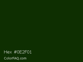 Hex #0e2f01 Color is a almost black green color and the nearest color is Deep Forest Green #182d09. Hex code #0e2f01 and RGB value is rgb(14,47,1). In RGB color space, this color is composed of 5% red, 18% green, 0% blue, In CMYK color space, this color is composed of 70% cyan, 0% magenta, 98% yellow , 82% black , In HSL color space, this color has a hue angle of 103° , 96% saturation and 9% lightness.
