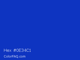 Hex #0e34c1 Color is a normal blue color and the nearest color is Persian Blue #1c39bb. Hex code #0e34c1 and RGB value is rgb(14,52,193). In RGB color space, this color is composed of 5% red, 20% green, 76% blue, In CMYK color space, this color is composed of 93% cyan, 73% magenta, 0% yellow , 24% black , In HSL color space, this color has a hue angle of 227° , 86% saturation and 41% lightness.