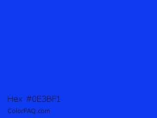 Hex #0e3bf1 Color is a normal blue color and the nearest color is Blue RYB #0247fe. Hex code #0e3bf1 and RGB value is rgb(14,59,241). In RGB color space, this color is composed of 5% red, 23% green, 95% blue, In CMYK color space, this color is composed of 94% cyan, 76% magenta, 0% yellow , 5% black , In HSL color space, this color has a hue angle of 228° , 89% saturation and 50% lightness.