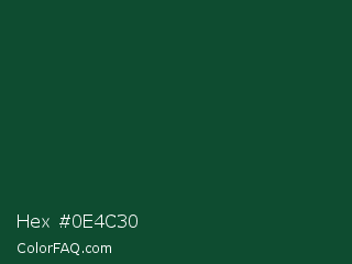 Hex #0e4c30 Color is a very dark green color and the nearest color is MSU Green #18453b. Hex code #0e4c30 and RGB value is rgb(14,76,48). In RGB color space, this color is composed of 5% red, 30% green, 19% blue, In CMYK color space, this color is composed of 82% cyan, 0% magenta, 37% yellow , 70% black , In HSL color space, this color has a hue angle of 153° , 69% saturation and 18% lightness.