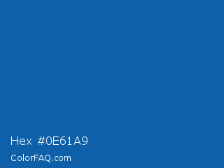 Hex #0e61a9 Color is a normal blue color and the nearest color is Green Blue #1164b4. Hex code #0e61a9 and RGB value is rgb(14,97,169). In RGB color space, this color is composed of 5% red, 38% green, 66% blue, In CMYK color space, this color is composed of 92% cyan, 43% magenta, 0% yellow , 34% black , In HSL color space, this color has a hue angle of 208° , 85% saturation and 36% lightness.
