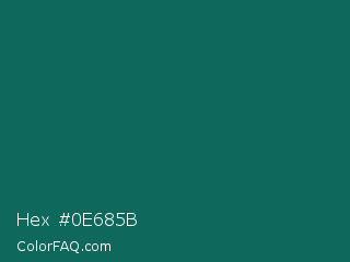 Hex #0e685b Color is a dark cyan color and the nearest color is Watercourse #056f57. Hex code #0e685b and RGB value is rgb(14,104,91). In RGB color space, this color is composed of 5% red, 41% green, 36% blue, In CMYK color space, this color is composed of 87% cyan, 0% magenta, 13% yellow , 59% black , In HSL color space, this color has a hue angle of 171° , 76% saturation and 23% lightness.