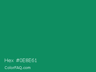 Hex #0e8e61 Color is a normal green color and the nearest color is Deep Green Cyan Turquoise #0e7c61. Hex code #0e8e61 and RGB value is rgb(14,142,97). In RGB color space, this color is composed of 5% red, 56% green, 38% blue, In CMYK color space, this color is composed of 90% cyan, 0% magenta, 32% yellow , 44% black , In HSL color space, this color has a hue angle of 159° , 82% saturation and 31% lightness.