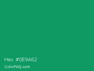 Hex #0e9a62 Color is a normal green color and the nearest color is Green Cyan #009966. Hex code #0e9a62 and RGB value is rgb(14,154,98). In RGB color space, this color is composed of 5% red, 60% green, 38% blue, In CMYK color space, this color is composed of 91% cyan, 0% magenta, 36% yellow , 40% black , In HSL color space, this color has a hue angle of 156° , 83% saturation and 33% lightness.
