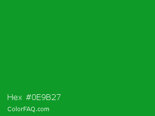 Hex #0e9b27 Color is a normal green color and the nearest color is North Texas Green #059033. Hex code #0e9b27 and RGB value is rgb(14,155,39). In RGB color space, this color is composed of 5% red, 61% green, 15% blue, In CMYK color space, this color is composed of 91% cyan, 0% magenta, 75% yellow , 39% black , In HSL color space, this color has a hue angle of 131° , 83% saturation and 33% lightness.