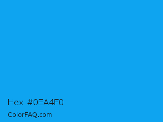 Hex #0ea4f0 Color is a normal blue color and the nearest color is Vivid Cerulean #00aaee. Hex code #0ea4f0 and RGB value is rgb(14,164,240). In RGB color space, this color is composed of 5% red, 64% green, 94% blue, In CMYK color space, this color is composed of 94% cyan, 32% magenta, 0% yellow , 6% black , In HSL color space, this color has a hue angle of 200° , 89% saturation and 50% lightness.