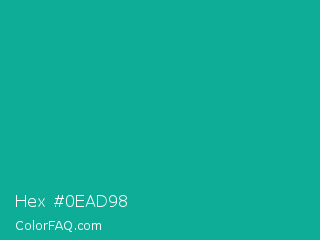 Hex #0ead98 Color is a normal cyan color and the nearest color is Persian Green #00a693. Hex code #0ead98 and RGB value is rgb(14,173,152). In RGB color space, this color is composed of 5% red, 68% green, 60% blue, In CMYK color space, this color is composed of 92% cyan, 0% magenta, 12% yellow , 32% black , In HSL color space, this color has a hue angle of 172° , 85% saturation and 37% lightness.