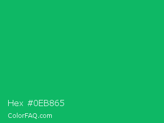 Hex #0eb865 Color is a normal green color and the nearest color is GO Green #00ab66. Hex code #0eb865 and RGB value is rgb(14,184,101). In RGB color space, this color is composed of 5% red, 72% green, 40% blue, In CMYK color space, this color is composed of 92% cyan, 0% magenta, 45% yellow , 28% black , In HSL color space, this color has a hue angle of 151° , 86% saturation and 39% lightness.