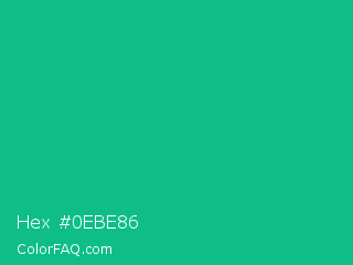 Hex #0ebe86 Color is a normal green color and the nearest color is Mountain Meadow Crayola #1ab385. Hex code #0ebe86 and RGB value is rgb(14,190,134). In RGB color space, this color is composed of 5% red, 75% green, 53% blue, In CMYK color space, this color is composed of 93% cyan, 0% magenta, 29% yellow , 25% black , In HSL color space, this color has a hue angle of 161° , 86% saturation and 40% lightness.