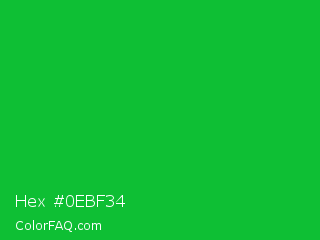 Hex #0ebf34 Color is a normal green color and the nearest color is Dark Pastel Green #03c03c. Hex code #0ebf34 and RGB value is rgb(14,191,52). In RGB color space, this color is composed of 5% red, 75% green, 20% blue, In CMYK color space, this color is composed of 93% cyan, 0% magenta, 73% yellow , 25% black , In HSL color space, this color has a hue angle of 133° , 86% saturation and 40% lightness.