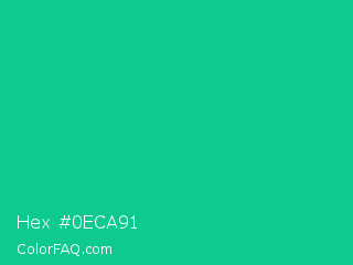 Hex #0eca91 Color is a normal green color and the nearest color is Caribbean Green #00cc99. Hex code #0eca91 and RGB value is rgb(14,202,145). In RGB color space, this color is composed of 5% red, 79% green, 57% blue, In CMYK color space, this color is composed of 93% cyan, 0% magenta, 28% yellow , 21% black , In HSL color space, this color has a hue angle of 162° , 87% saturation and 42% lightness.