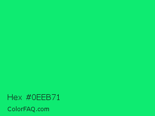Hex #0eeb71 Color is a normal green color and the nearest color is Spring Green #00ff7f. Hex code #0eeb71 and RGB value is rgb(14,235,113). In RGB color space, this color is composed of 5% red, 92% green, 44% blue, In CMYK color space, this color is composed of 94% cyan, 0% magenta, 52% yellow , 8% black , In HSL color space, this color has a hue angle of 147° , 89% saturation and 49% lightness.