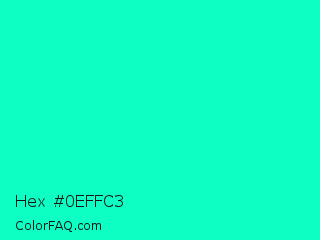 Hex #0effc3 Color is a normal cyan color and the nearest color is Bright Turquoise #08e8de. Hex code #0effc3 and RGB value is rgb(14,255,195). In RGB color space, this color is composed of 5% red, 100% green, 76% blue, In CMYK color space, this color is composed of 95% cyan, 0% magenta, 24% yellow , 0% black , In HSL color space, this color has a hue angle of 165° , 100% saturation and 53% lightness.