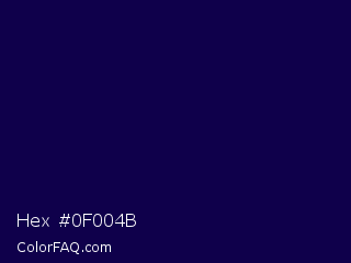 Hex #0f004b Color is a very dark indigo color and the nearest color is Tolopea #1b0245. Hex code #0f004b and RGB value is rgb(15,0,75). In RGB color space, this color is composed of 6% red, 0% green, 29% blue, In CMYK color space, this color is composed of 80% cyan, 100% magenta, 0% yellow , 71% black , In HSL color space, this color has a hue angle of 252° , 100% saturation and 15% lightness.