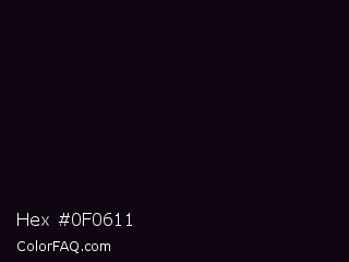 Hex #0f0611 Color is a almost black purple color and the nearest color is Woodsmoke #0c0d0f. Hex code #0f0611 and RGB value is rgb(15,6,17). In RGB color space, this color is composed of 6% red, 2% green, 7% blue, In CMYK color space, this color is composed of 12% cyan, 65% magenta, 0% yellow , 93% black , In HSL color space, this color has a hue angle of 289° , 48% saturation and 5% lightness.