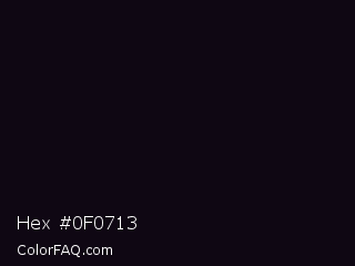 Hex #0f0713 Color is a almost black purple color and the nearest color is Woodsmoke #0c0d0f. Hex code #0f0713 and RGB value is rgb(15,7,19). In RGB color space, this color is composed of 6% red, 3% green, 7% blue, In CMYK color space, this color is composed of 21% cyan, 63% magenta, 0% yellow , 93% black , In HSL color space, this color has a hue angle of 280° , 46% saturation and 5% lightness.