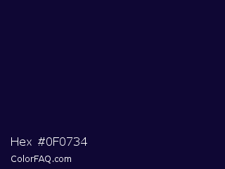 Hex #0f0734 Color is a very dark indigo color and the nearest color is Black Rock #0d0332. Hex code #0f0734 and RGB value is rgb(15,7,52). In RGB color space, this color is composed of 6% red, 3% green, 20% blue, In CMYK color space, this color is composed of 71% cyan, 87% magenta, 0% yellow , 80% black , In HSL color space, this color has a hue angle of 251° , 76% saturation and 12% lightness.