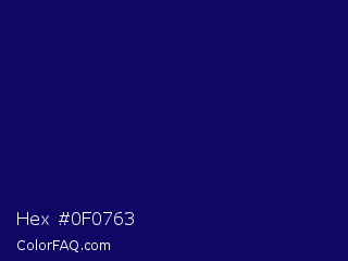 Hex #0f0763 Color is a very dark indigo color and the nearest color is Arapawa #110c6c. Hex code #0f0763 and RGB value is rgb(15,7,99). In RGB color space, this color is composed of 6% red, 3% green, 39% blue, In CMYK color space, this color is composed of 85% cyan, 93% magenta, 0% yellow , 61% black , In HSL color space, this color has a hue angle of 245° , 87% saturation and 21% lightness.