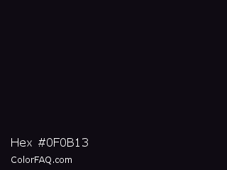 Hex #0f0b13 Color is a almost black violet color and the nearest color is Woodsmoke #0c0d0f. Hex code #0f0b13 and RGB value is rgb(15,11,19). In RGB color space, this color is composed of 6% red, 4% green, 7% blue, In CMYK color space, this color is composed of 21% cyan, 42% magenta, 0% yellow , 93% black , In HSL color space, this color has a hue angle of 270° , 27% saturation and 6% lightness.