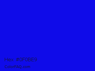 Hex #0f0be9 Color is a normal indigo color and the nearest color is Bluebonnet #1c1cf0. Hex code #0f0be9 and RGB value is rgb(15,11,233). In RGB color space, this color is composed of 6% red, 4% green, 91% blue, In CMYK color space, this color is composed of 94% cyan, 95% magenta, 0% yellow , 9% black , In HSL color space, this color has a hue angle of 241° , 91% saturation and 48% lightness.