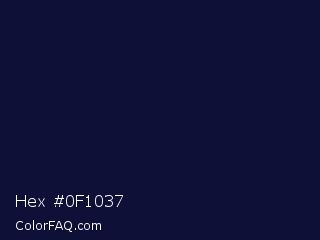 Hex #0f1037 Color is a very dark blue color and the nearest color is Haiti #1b1035. Hex code #0f1037 and RGB value is rgb(15,16,55). In RGB color space, this color is composed of 6% red, 6% green, 22% blue, In CMYK color space, this color is composed of 73% cyan, 71% magenta, 0% yellow , 78% black , In HSL color space, this color has a hue angle of 239° , 57% saturation and 14% lightness.