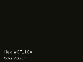 Hex #0f110a Color is a almost black lime color and the nearest color is Marshland #0b0f08. Hex code #0f110a and RGB value is rgb(15,17,10). In RGB color space, this color is composed of 6% red, 7% green, 4% blue, In CMYK color space, this color is composed of 12% cyan, 0% magenta, 41% yellow , 93% black , In HSL color space, this color has a hue angle of 77° , 26% saturation and 5% lightness.