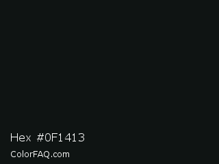 Hex #0f1413 Color is a almost black cyan color and the nearest color is Bunker #0d1117. Hex code #0f1413 and RGB value is rgb(15,20,19). In RGB color space, this color is composed of 6% red, 8% green, 7% blue, In CMYK color space, this color is composed of 25% cyan, 0% magenta, 5% yellow , 92% black , In HSL color space, this color has a hue angle of 168° , 14% saturation and 7% lightness.