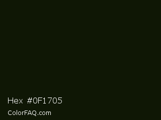 Hex #0f1705 Color is a almost black green color and the nearest color is Green Waterloo #101405. Hex code #0f1705 and RGB value is rgb(15,23,5). In RGB color space, this color is composed of 6% red, 9% green, 2% blue, In CMYK color space, this color is composed of 35% cyan, 0% magenta, 78% yellow , 91% black , In HSL color space, this color has a hue angle of 87° , 64% saturation and 5% lightness.