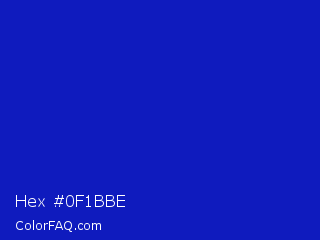 Hex #0f1bbe Color is a normal blue color and the nearest color is Blue Pantone #0018a8. Hex code #0f1bbe and RGB value is rgb(15,27,190). In RGB color space, this color is composed of 6% red, 11% green, 75% blue, In CMYK color space, this color is composed of 92% cyan, 86% magenta, 0% yellow , 25% black , In HSL color space, this color has a hue angle of 236° , 85% saturation and 40% lightness.