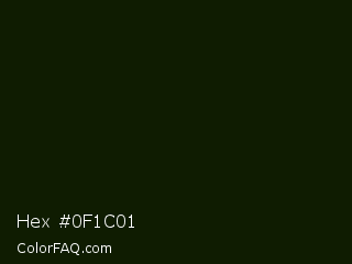 Hex #0f1c01 Color is a almost black green color and the nearest color is Green Waterloo #101405. Hex code #0f1c01 and RGB value is rgb(15,28,1). In RGB color space, this color is composed of 6% red, 11% green, 0% blue, In CMYK color space, this color is composed of 46% cyan, 0% magenta, 96% yellow , 89% black , In HSL color space, this color has a hue angle of 89° , 93% saturation and 6% lightness.