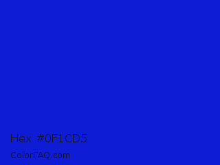 Hex #0f1cd5 Color is a normal blue color and the nearest color is Bluebonnet #1c1cf0. Hex code #0f1cd5 and RGB value is rgb(15,28,213). In RGB color space, this color is composed of 6% red, 11% green, 84% blue, In CMYK color space, this color is composed of 93% cyan, 87% magenta, 0% yellow , 16% black , In HSL color space, this color has a hue angle of 236° , 87% saturation and 45% lightness.