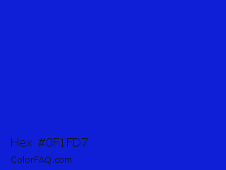 Hex #0f1fd7 Color is a normal blue color and the nearest color is Bluebonnet #1c1cf0. Hex code #0f1fd7 and RGB value is rgb(15,31,215). In RGB color space, this color is composed of 6% red, 12% green, 84% blue, In CMYK color space, this color is composed of 93% cyan, 86% magenta, 0% yellow , 16% black , In HSL color space, this color has a hue angle of 235° , 87% saturation and 45% lightness.
