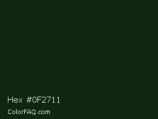 Hex #0f2711 Color is a very dark green color and the nearest color is Palm Green #09230f. Hex code #0f2711 and RGB value is rgb(15,39,17). In RGB color space, this color is composed of 6% red, 15% green, 7% blue, In CMYK color space, this color is composed of 62% cyan, 0% magenta, 56% yellow , 85% black , In HSL color space, this color has a hue angle of 125° , 44% saturation and 11% lightness.