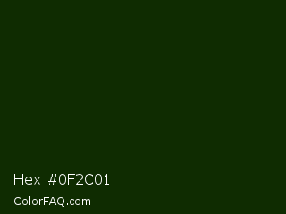 Hex #0f2c01 Color is a almost black green color and the nearest color is Deep Forest Green #182d09. Hex code #0f2c01 and RGB value is rgb(15,44,1). In RGB color space, this color is composed of 6% red, 17% green, 0% blue, In CMYK color space, this color is composed of 66% cyan, 0% magenta, 98% yellow , 83% black , In HSL color space, this color has a hue angle of 100° , 96% saturation and 9% lightness.