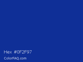 Hex #0f2f97 Color is a normal blue color and the nearest color is Torea Bay #0f2d9e. Hex code #0f2f97 and RGB value is rgb(15,47,151). In RGB color space, this color is composed of 6% red, 18% green, 59% blue, In CMYK color space, this color is composed of 90% cyan, 69% magenta, 0% yellow , 41% black , In HSL color space, this color has a hue angle of 226° , 82% saturation and 33% lightness.